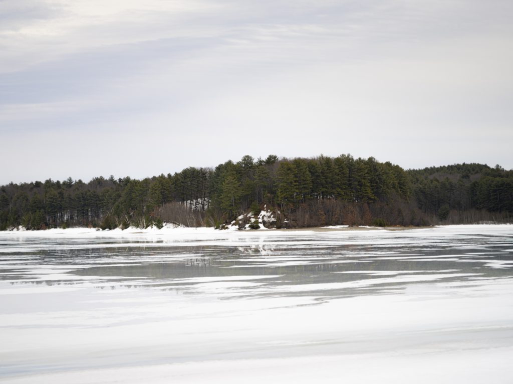 The image above was made at Wachusett Reservoir in Boylston, Massachusetts — a 4.1 billion gallon drinking water reservoir that serves greater Boston and one of the more striking natural landscapes in central Massachusetts. In late winter, when the ice begins to fracture and recede but hasn’t fully surrendered to the season, the reservoir takes on a quality that’s almost painterly: pale, reflective ice in the foreground; a dark tree line of Eastern white pine and bare hardwoods across the far shore; a high-pressure sky striated with thin cirrus cloud.