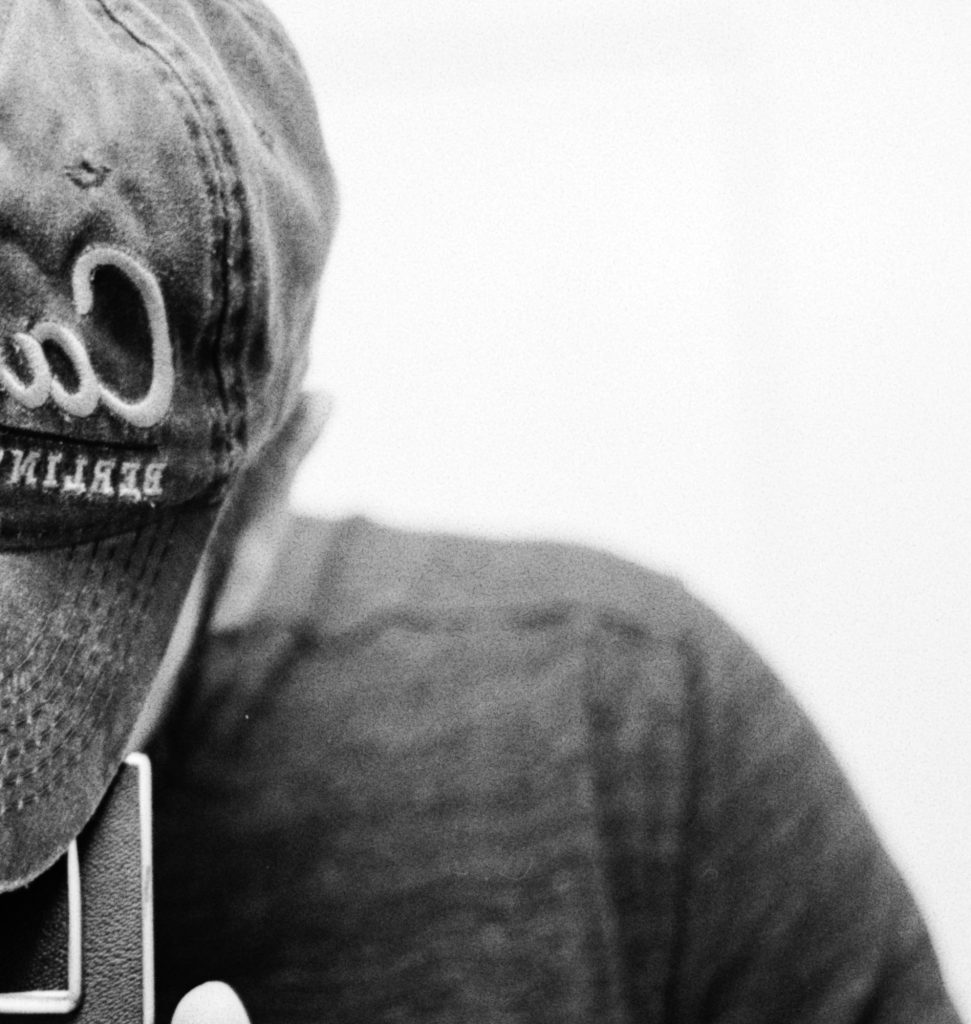 The grain here is doing real work. In the smooth tonality of the white wall behind me, you can see Rodinal’s grain character clearly: defined, structured, not random digital noise but organized silver crystal clusters with actual shape. The gray t-shirt renders beautifully — a mid-tone where Rodinal’s acutance shows as micro-contrast within the fabric texture. The hat brim and the camera’s leather body have excellent shadow detail, which is notable for 1:25 development, where shadow compression can be an issue.