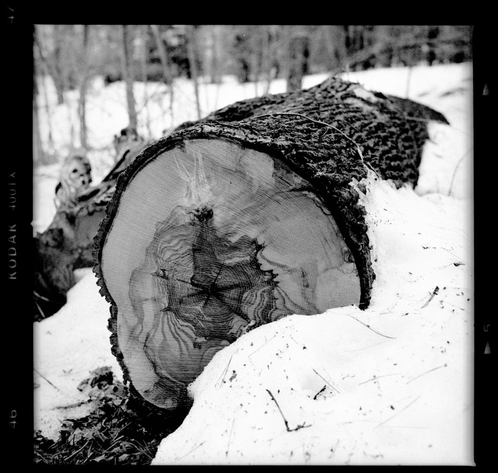 The snow is luminous without being blocked. It reads as white while retaining surface texture — you can see debris, twigs, and shadow detail in the snow near the log’s base. This is the kind of highlight retention that well-exposed Tri-X provides, and which Rodinal’s moderate shadow/highlight behavior preserves.
