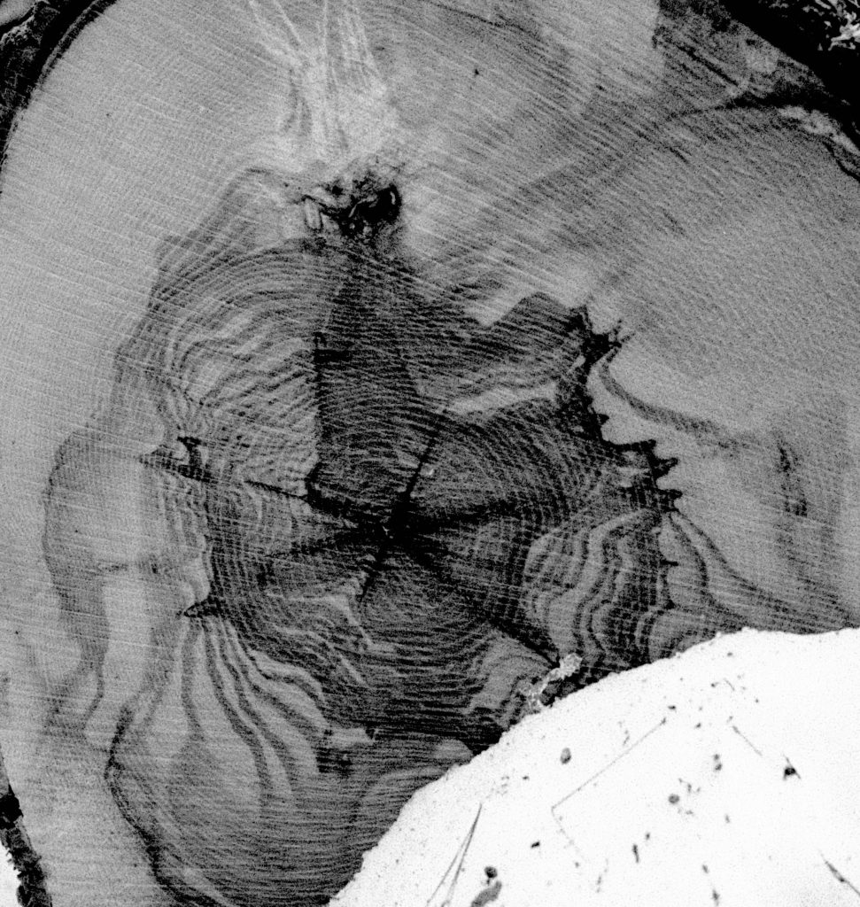 The end grain of the log is extraordinary. The annual rings, radial cracks, and the complex pattern of the heartwood versus sapwood are rendered with surgical clarity. The high acutance of Rodinal has emphasized every edge within the wood structure — you can trace individual growth rings, see the differential hardness between early and late wood, and read the history of the tree in the photograph. This is Rodinal doing what no solvent developer could do as well.