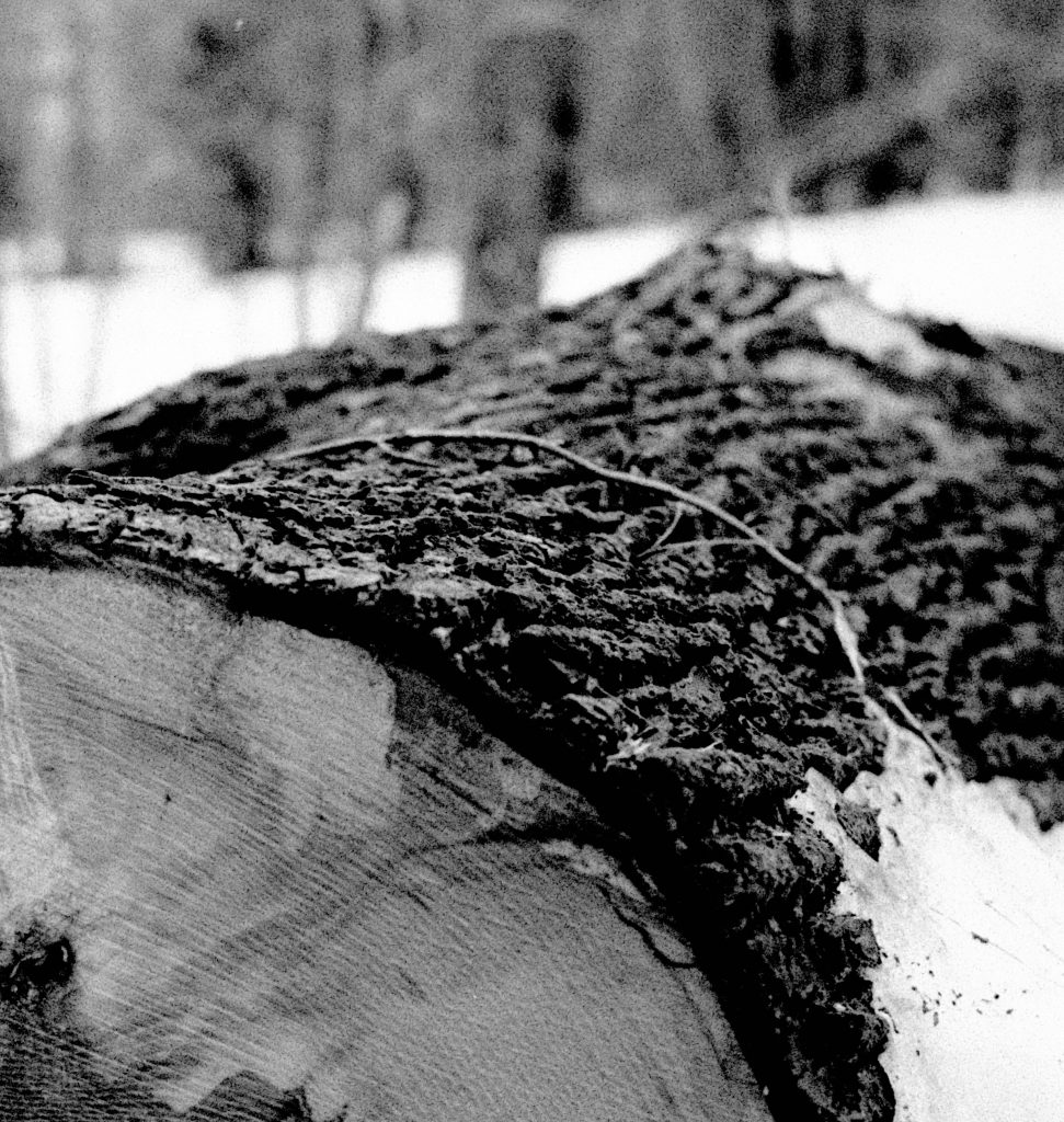 The bark on the upper surface of the log is deeply textured and dark — the roughest tonal transition in the image — and the grain in this area is most visible. Rodinal’s grain tends to be most apparent in mid-to-shadow tones, and the bark confirms this: it has a beautiful, almost etched quality.